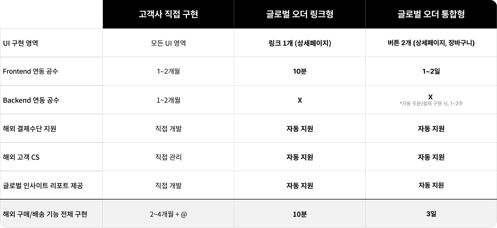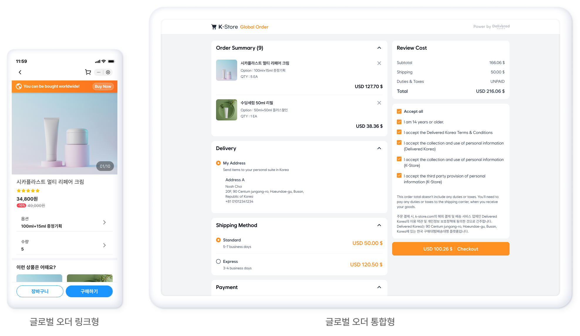 해외 구매자에게 해외 배송과 결제를 지원하는 글로벌체크아웃 주문서를 제공합니다.